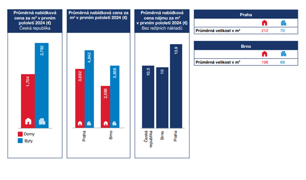 Průměrná nabídková cena za metr čtvereční u českých nemovitostí vzrostla v prvním pololetí o 4 % ve srovnání s prvním pololetím roku 2023. Nejvýraznější nárůst byl zaznamenán v Praze, kde ceny nemovitostí, zejména rodinných domů, vzrostly o 7 %.
