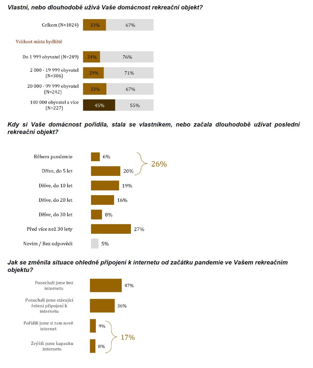 Bez internetu zůstala jen každá druhá (47 %) chata nebo chalupa, naopak 17 % získalo nové nebo kvalitnější připojení. Třetina (36 %) byla „online“ už před pandemií.