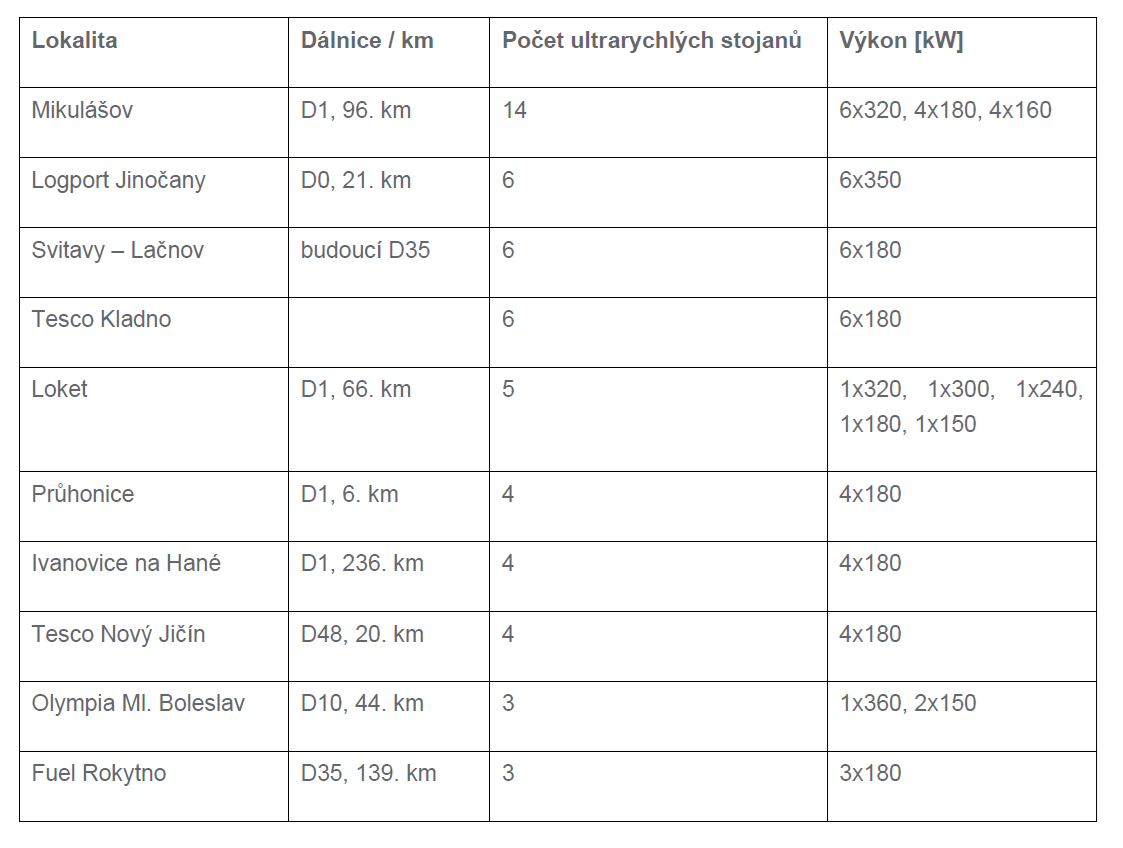 Top 10 největších ultrarychlých dobíjecích hubů ČEZ v ČR: