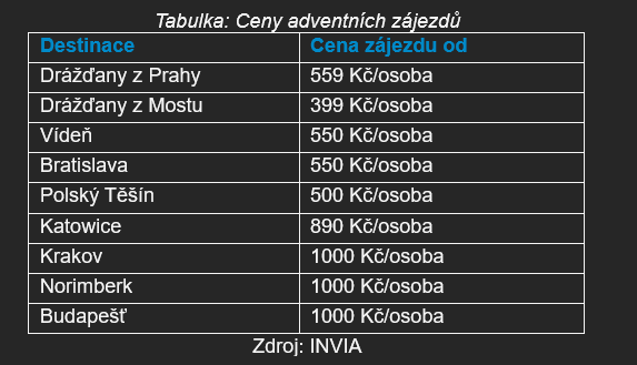 Čím dál více Čechů si užívá kouzlo adventní atmosféry v evropských městech. Tento trend potvrzují i data cestovní agentury Invia, největšího online prodejce zájezdů v Česku, která eviduje meziroční nárůst prodejů adventních zájezdů o desetinu. Největší zájem je o jednodenní výlety, které tvoří až 70 % rezervací. Češi nejčastěji míří na vánoční trhy do Německa, Vídně nebo Polska.