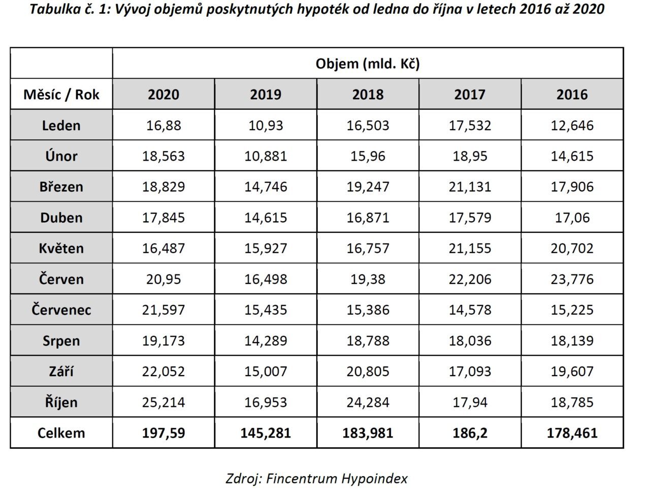 Za prvních 10 měsíců roku poskytly banky hypotéky již za 197,59 miliard korun. Dosud se hypotečnímu trhu nepovedlo přiblížit se hranici 200 miliard korun již v říjnu. Ve srovnání s rekordním rokem 2017 je letošní objem poskytovaných hypoték téměř o 11,4 miliardy korun vyšší. Meziročně se objem zvýšil dokonce o více než 52 miliard korun.