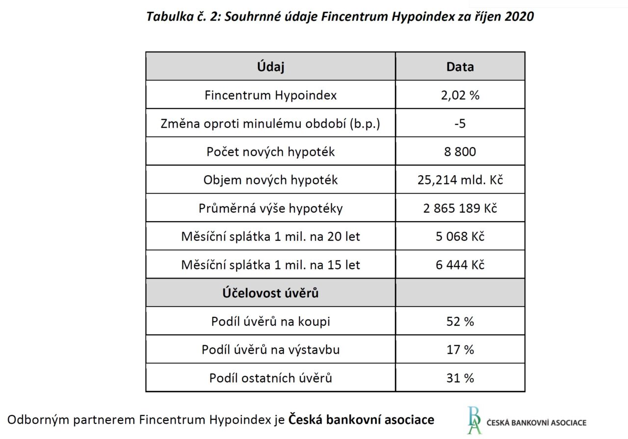 Říjen se s objemem poskytnutých hypoték ve výši 25,214 miliardy korun stal druhým nejúspěšnějším měsícem v historii Fincentrum Hypoindexu. „K rekordnímu roku tak již zbývá jen malý krůček. Průměrná úroková sazba hypoték se přiblížila dvouprocentní hranici,“ řekl Jiří Sýkora, specialista oddělení produktového managementu společnosti Fincentrum & Swiss Life Select.