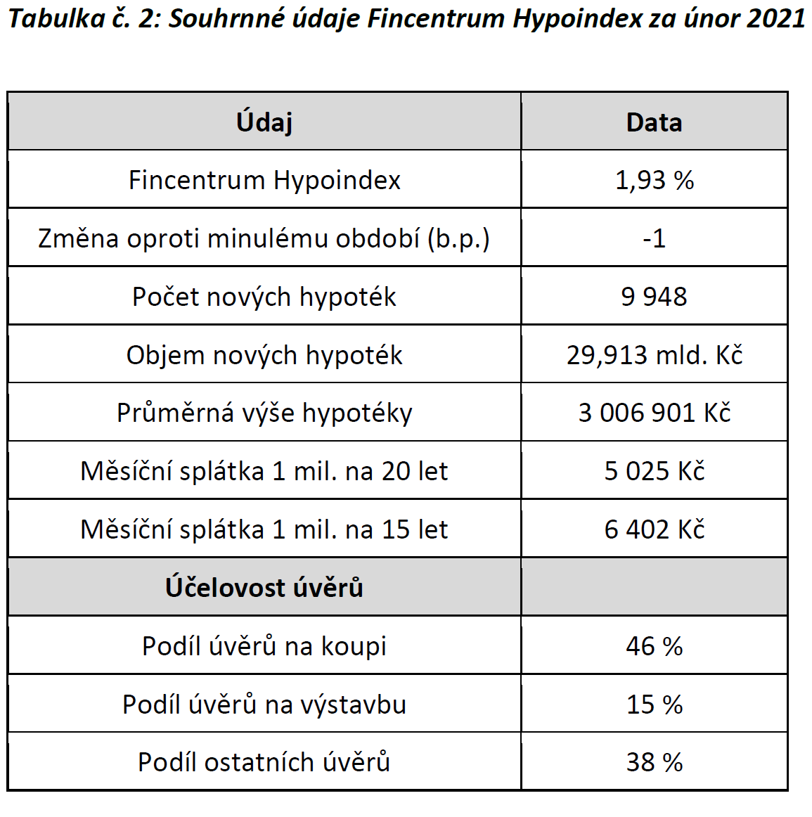 Hypoteční trh dál láme rekordy. „Únor se s objemem poskytnutých hypoték téměř 30 miliard korun stal nejsilnějším měsícem v historii ukazatele Fincentrum Hypoindex. Pokračuje i pokles průměrné úrokové sazby hypoték. Průměrná hypotéka překonala třímilionovou hranici,“ řekl Jiří Sýkora, hypoteční specialista společnosti Fincentrum & Swiss Life Select.
