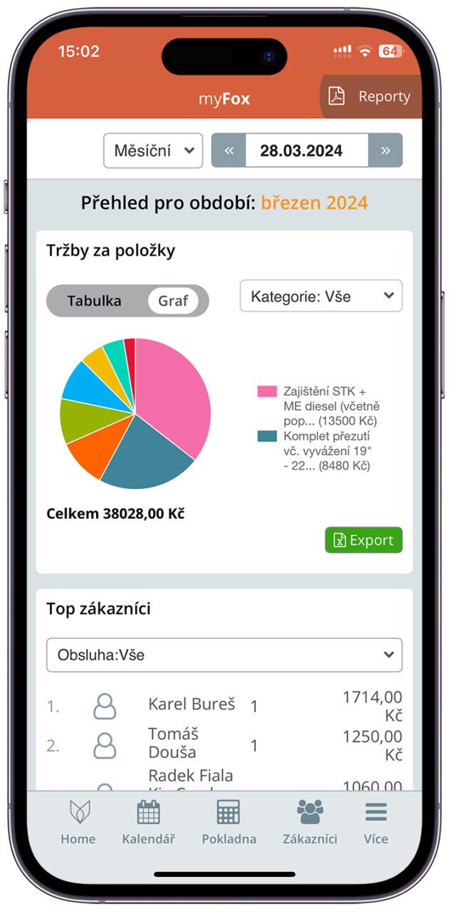 MYFOX umožňuje snadno nastavit roční období pro zobrazení statistik a generování přehledných reportů. Uživatelé tak získají komplexní pohled na celkové tržby, výkonnost jednotlivých služeb i oblíbenost různých způsobů objednávání – například kolik rezervací vzniklo online a kolik jich bylo zadáno ručně v aplikaci. K dispozici je také roční vyhodnocení nejlepších zákazníků. Statistiky za rok 2024 zobrazíte v modulu Statistiky výběrem možnosti Období → Roční a volbou libovolného data z loňska. Reporty, jako je Přehled tržeb nebo Rekapitulace příjmů, si jednoduše stáhnete ve formátu PDF přes zelené tlačítko Reporty. Další přehledy, například Výpis všech transakcí nebo PDF všech vydaných účtenek, najdete v sekci Pokladna → Více → Vydané účtenky. Tato funkce poskytne důležitá data pro strategické plánování i účetní uzávěrku.