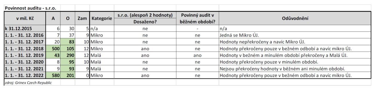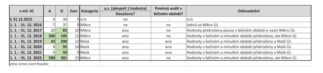 Pro ilustraci je v níže uvedených tabulkách naznačena změna zařazení účetní jednotky a s ní související povinnost auditu.