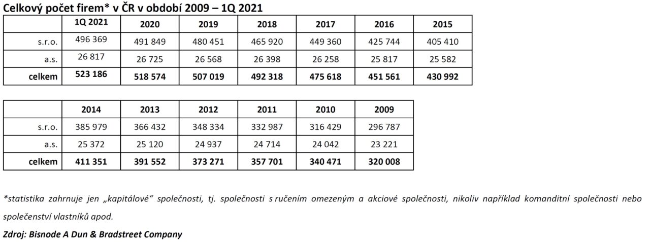 V České republice bylo ke konci prvního kvartálu registrováno celkem 523 186 firem, z toho 496 369 společností s ručením omezeným a 26 817 akciových společností. Přesto, že za první tři měsíce letošního roku vzniklo 8 025 nových firem, celkový počet registrovaných subjektů se zvýšil pouze o 4 612.