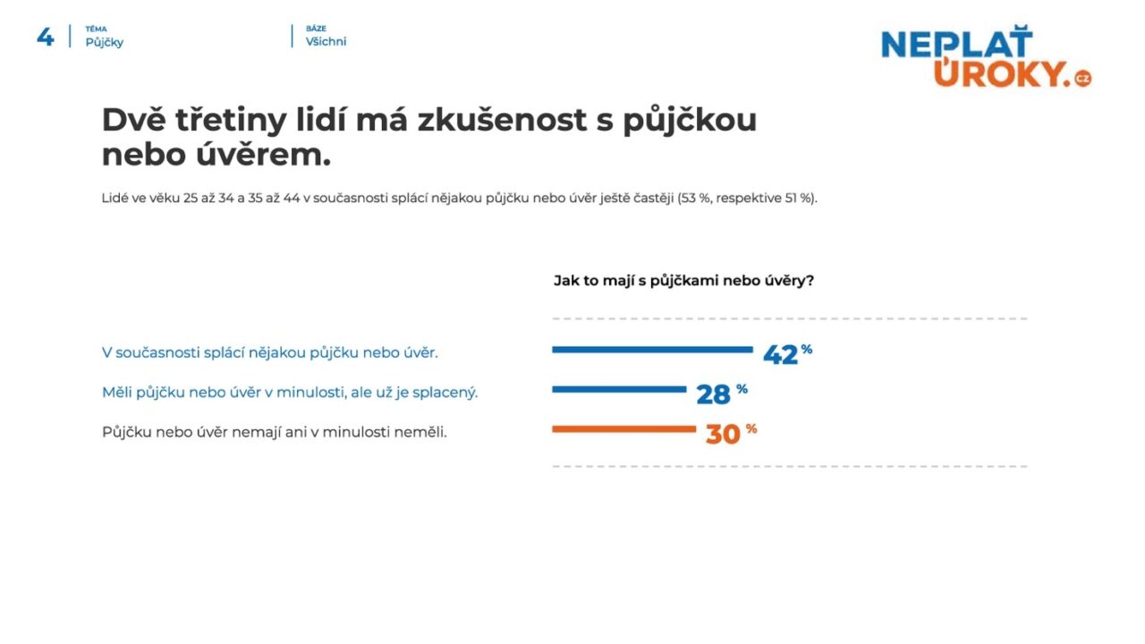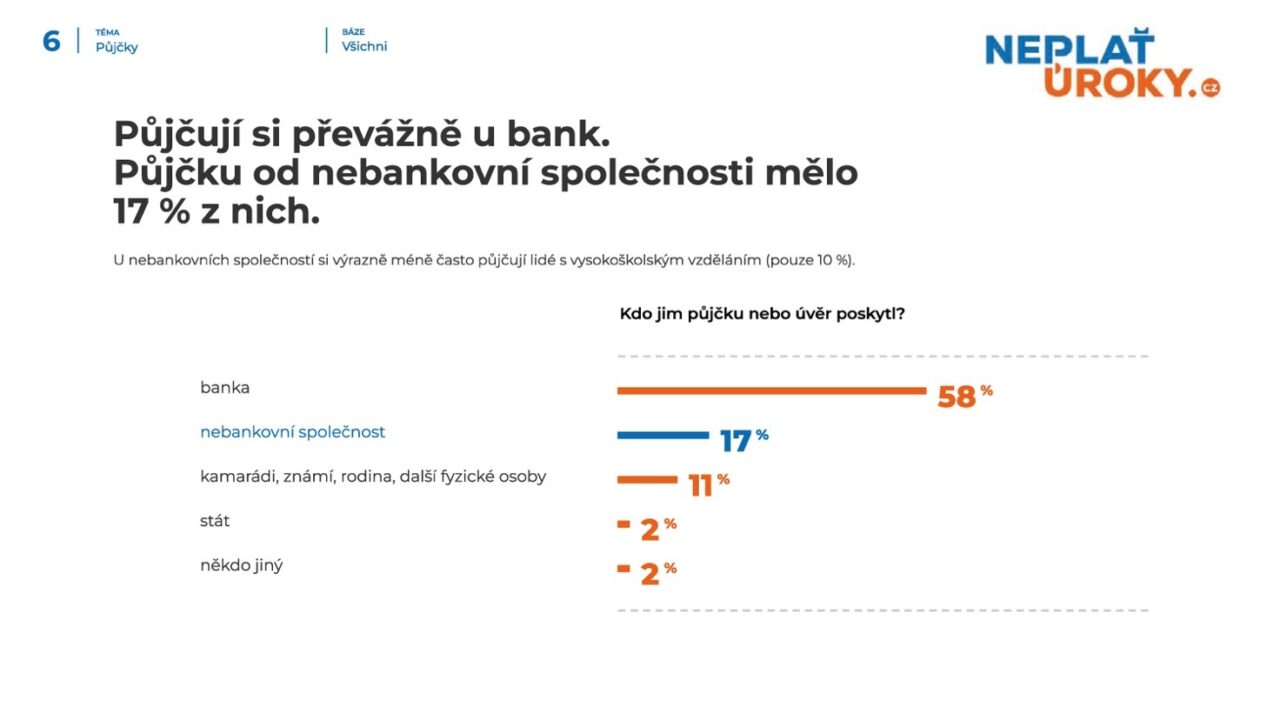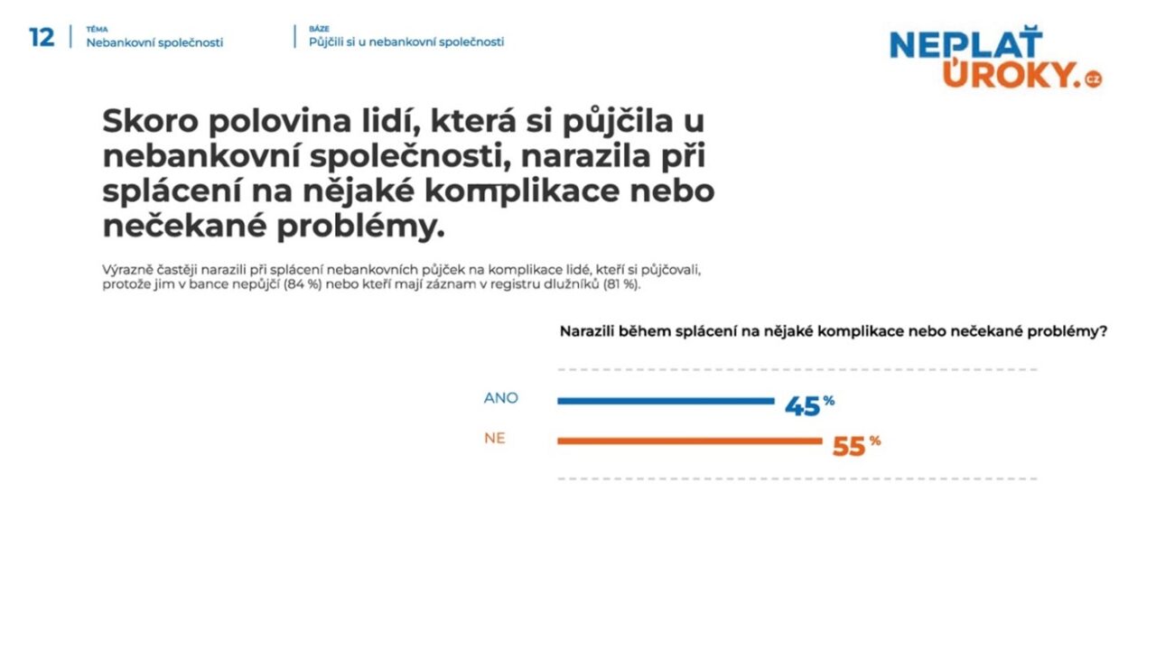 Komplikace při splácení nebankovních půjček – takřka polovina lidí, kteří si vzali půjčku u nebankovní společnosti, následně při splácení narazila na problémy či nečekané komplikace (cca 45 %). „Mezi nejčastější potíže patřilo to, že dlužníci řešili půjčku další půjčkou nebo čelili extrémně vysokým úrokům, které nedokázali platit,“ upřesňuje Rajf. „Mnozí také zmiňovali penále a pokuty za sebemenší zpoždění splátky či ztrátu příjmu během splácení. Výsledkem bývá začarovaný kruh dluhů – další půjčky, rostoucí úroky a sankce, které mohou vyústit až v exekuce,“ pokračuje Rajf.