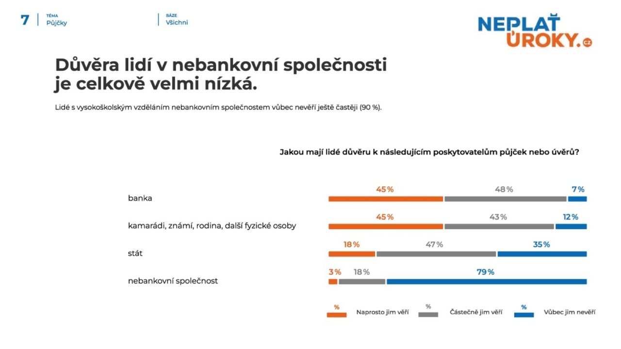 Přibližně 80 % lidí s nízkými příjmy uvádí, že nebankovním poskytovatelům půjček vůbec nevěří, zatímco plnou důvěru mají jen zanedbatelná 3 %. Přesto se mnoho z nich na nebankovní společnosti obrací – často proto, že nemají jinou možnost. Podle dat průzkumu si půjčku od nebankovní společnosti někdy vzal zhruba každý šestý respondent (cca 17 %). Důvodem bývá rychlá dostupnost peněz a benevolentnější podmínky. Lidé v tísni volí nebankovní půjčky i přes svou nedůvěru, protože například v bance už by půjčku nedostali, nebo potřebují jen malou částku okamžitě.