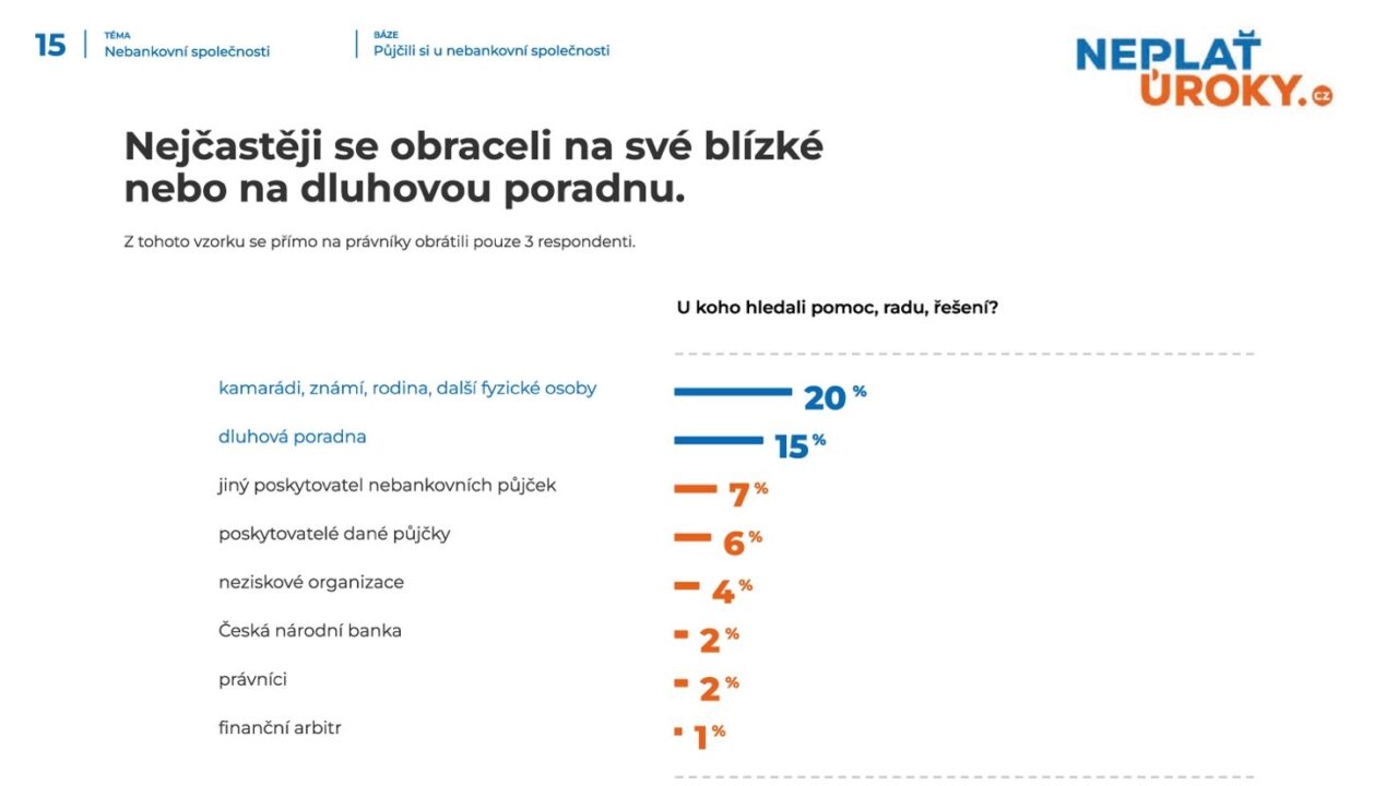 Setkáváme se s případy, kdy lidé s nízkými příjmy podepsali smlouvy s RPSN v řádu stovek až tisíců procent, aniž by si byli vědomi skutečných nákladů. Často si nebankovní úvěr berou v dobré víře, že vyřeší svou krátkodobou finanční tíseň, ale nakonec platí mnohem víc, než si mohli dovolit,“ upozorňuje advokát Vladimír Rajf. Taková negativní zkušenost není výjimkou. Dlužníci, kteří se ocitli v problémech, hledali pomoc při splácení svého nebankovního úvěru u svých blízkých nebo u odborníků. „Pokud tito lidé musí požádat o pomoc rodinu či dluhové poradce, znamená to, že podmínky půjčky byly nad jejich síly a mohly je dohnat až na pokraj finančního kolapsu,“ doplňuje Rajf.