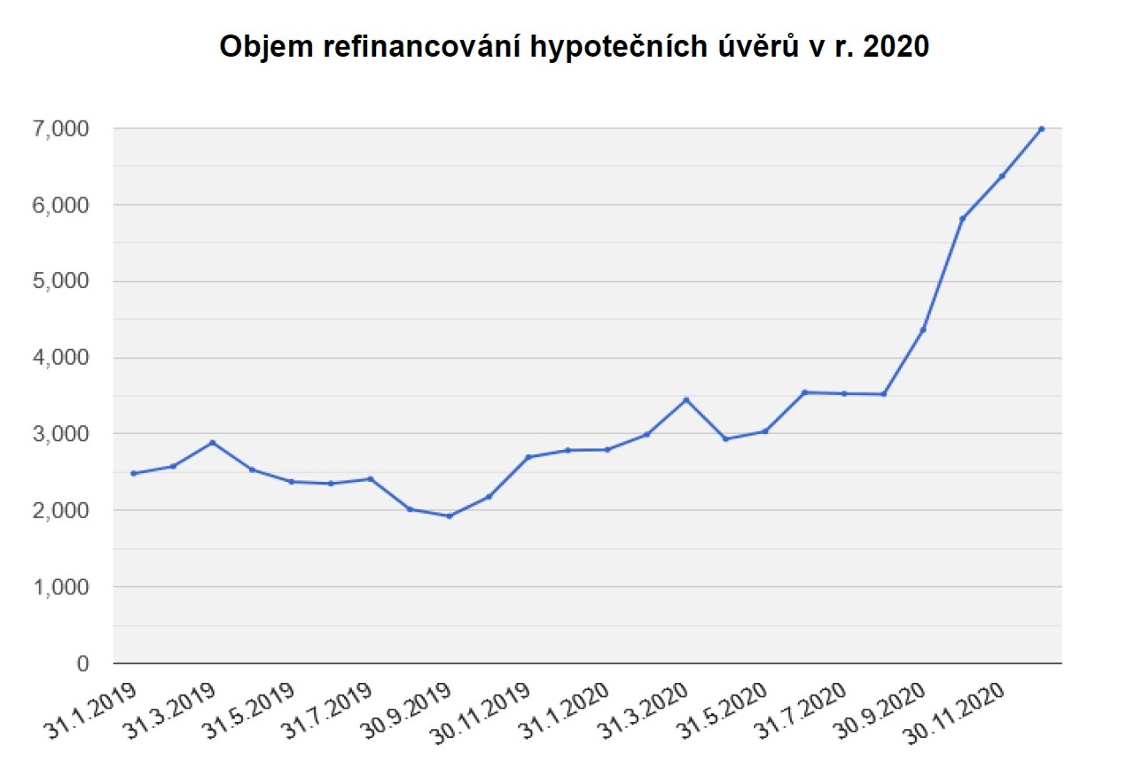 Refinancování hypotečních úvěrů od bank a stavebních spořitelen (tj. přechod k jiné bance) za prosinec výrazně vzrostlo, a to na 7,0 mld. korun. To je největší objem refinancování v historii hypotečních úvěrů v ČR.