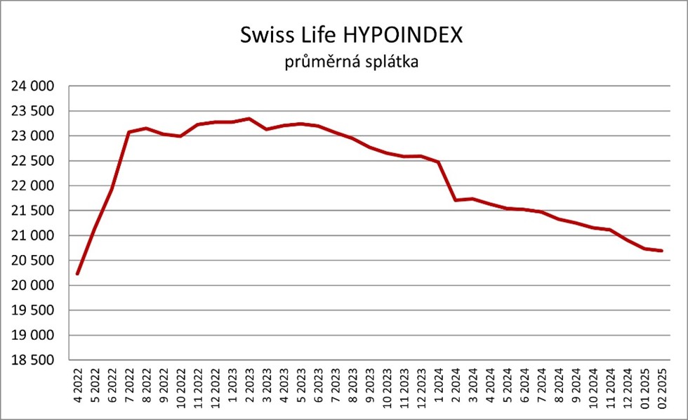 Měsíční splátka hypotečního úvěru ve výši 3,5 milionu korun sjednaného do 80 % odhadní ceny nemovitosti (LTV) při splatnosti 25 let a průměrné nabídkové sazbě 5,11 % p. a. činí v únoru 20 692 korun. Ti, kteří si nyní berou hypotéku, ušetří z rodinného rozpočtu každý měsíc více než tisíc korun ve srovnání se situací před rokem. V únoru 2024 totiž měsíční splátka v tomto modelovém příkladu dosahovala 21 703 korun při nabídkové sazbě 5,6 %.