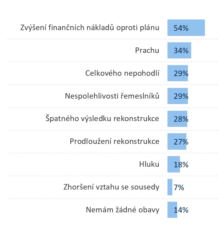 A jaké další obavy jsou s velkými změnami domova nejčastěji spojené? Více než polovina lidí (54 %) se obává, že se rekonstrukce prodraží. Druhou nejčastější obavou je prašnost (34 %) a celkové nepohodlí (29 %). Často se také lidé bojí, že řemeslníci budou nespolehliví (29 %) nebo že se rekonstrukce příliš prodlouží (27 %).