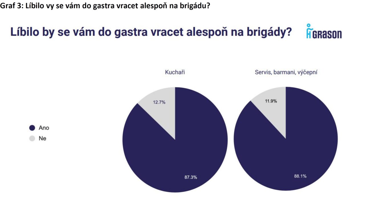 Devadesát procent dotázaných je ochotno se vracet do gastronomie na brigády, jak sami říkají, je to pro ně srdcová záležitost. Otázkou je, jak na tento trend zareagují majitelé restaurací a zdali například změní zažitý krátký/dlouhý týden nebo rozdělí celodenní směny mezi více pracovníků.