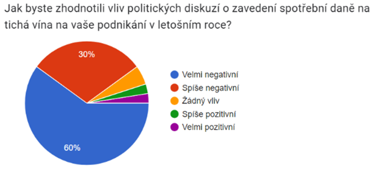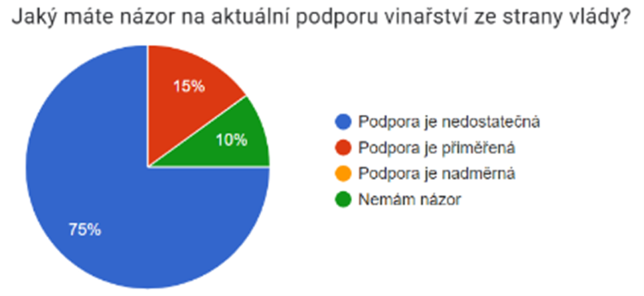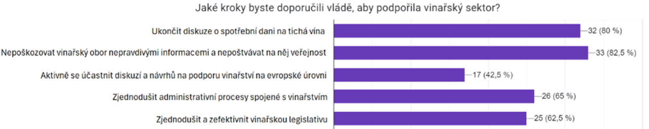 Podpora vinařství ze strany české vlády však není dostatečná, jak se shodují tři čtvrtiny respondentů. Za nejdůležitější kroky k nápravě považují ukončení diskuzí o spotřební dani a nepravdivých informací, které poškozují vinařský obor. Zároveň volají po zjednodušení legislativy a administrativních procesů, jakožto i po aktivnějším zapojení českých zástupců v evropských jednáních.