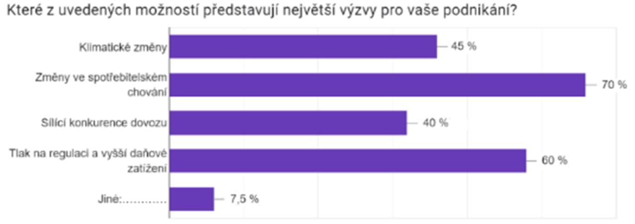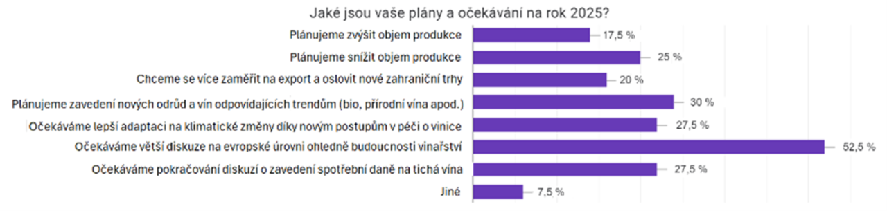 Za největší výzvy označili vinaři především změny ve spotřebitelském chování (70 %) a tlak na regulaci a vyšší daňové zatížení (60 %). V reakci na měnící se preference českých zákazníků plánuje téměř třetina (30 %) soustředit se více na nové odrůdy a kategorie, jako jsou biovína nebo vína s nižším obsahem alkoholu.