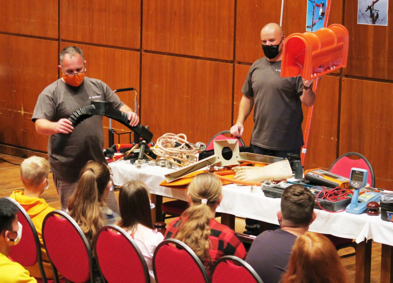 Jaroslav Šubrt a David Synek (za stolem) ze skupiny Sítě ČEZ Distribuce v České Lípě ukazují žákům deváté třídy ze ZŠ Slovanka ochranné pomůcky montérů pro práci pod napětím.