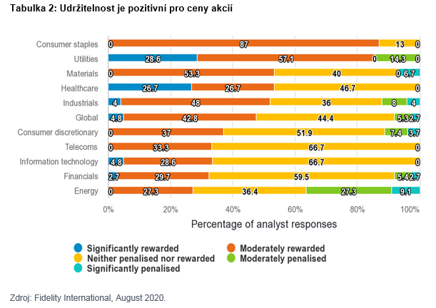 Podle srpnového průzkumu ztratí s největší pravděpodobností firmy ze sektoru energetiky podporu trhu pro přijímání kroků k lepší udržitelnosti. Celkemm 36 procent analytiků přitom uvedlo, že jejich společnosti by za to mohly být trhem potrestány. Naopak v průmyslových odvětvích, jako jsou utility a spotřební zboží, více než 80 procent respondentů uvedlo, že trh odmění další investice do podpory udržitelnosti.