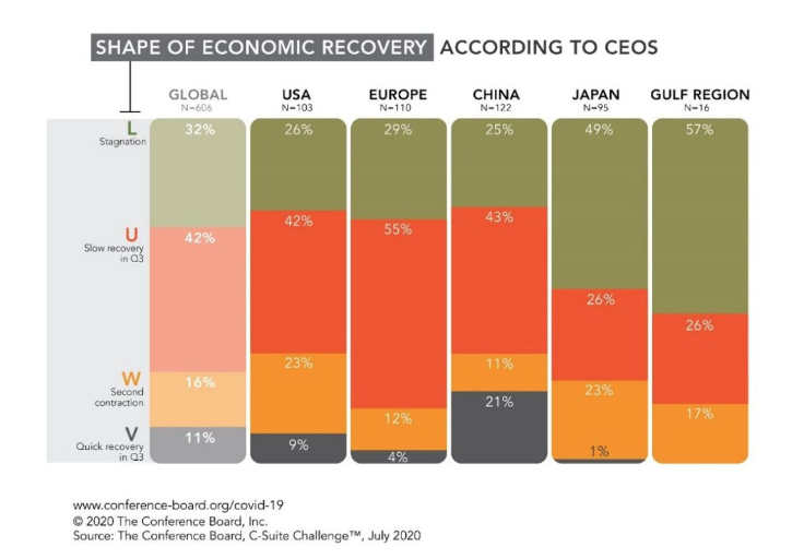 Manažeři z evropských zemí, Spojených států a Číny nejčastěji očekávají vývoj ve tvaru U-křivky. U nás se také mluví o návratu zpět na úroveň loňského roku v horizontu 2-3 let. Z vyspělých zemí jsou nejvíce pesimističtí v Japonsku. Jejich názor bude jistě ovlivněn zkušenostmi s japonskou ekonomikou za posledních 20 let. L-křivku již zažili.