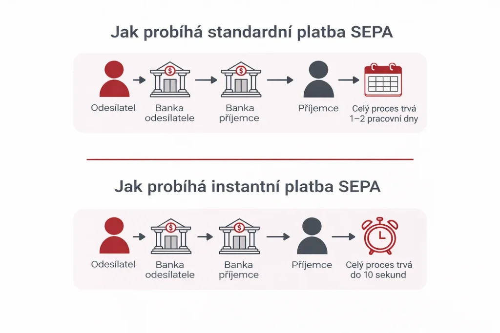 - SEPA Instant (SCT Inst) – moderní varianta umožňující okamžité platby v eurech. Na protiúčet dorazí během několika sekund, tedy pokud okamžité platby podporují obě banky.