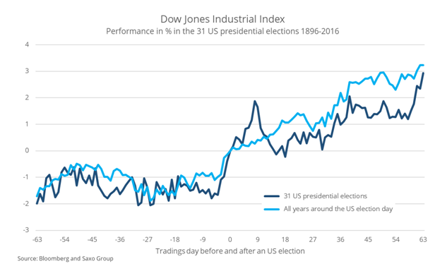 Prozkoumali jsme všech 31 případů amerických prezidentských voleb za období 1896-2016, abychom objasnili, jak se chová americký akciový trh před volbami a po nich. V průměru zůstávají americké akcie, měřené indexem Dow Jones Industrial Average, před prezidentskými volbami na původních pozicích a po volbách stoupnou zhruba o 3 %.