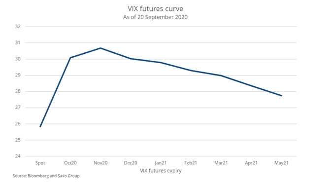 Denní volatilita 1,01 % po amerických volbách odpovídá v přepočtu na rok zhruba 16 %, a je tedy mnohem nižší než aktuální implikovaná volatilita měřená křivkou futures na index VIX. Tady vidíme, že implikovaná volatilita forwardu za 30 dní pro měsíce říjen, listopad a prosinec v přepočtu na rok překročila hodnotu 30. Vyšší skutečnou volatilitu jsme zaznamenaly jen u voleb v letech 1916, 1932 a 2008, z čehož vyplývá, že aktuální ceny VIX nepočítají se scénářem s opravdovým koncovým rizikem. V případě zpochybněných voleb, nebo pokud by vyhrál Biden, se může docela dobře ukázat, že byla volatilita před volbami ještě laciná.