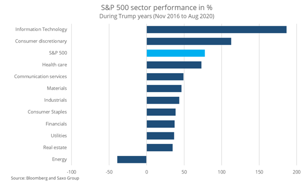 Většina zisků pocházela ze tří sektorů – informačních technologií, zboží občasné spotřeby a zdravotnictví. Právě ty, spolu s komunikačními službami (jejichž definice byla v září 2018 rozšířena i na sociální média), nejvíc získaly z Trumpovy reformy zdanění právnických osob v roce 2017. Naopak tradiční sektory jako energetika, finance a nemovitosti, u nichž by člověk čekal, že si povedou skvěle, patřily za Trumpa mezi nejslabší. Energetika je dokonce jediný sektor, který měl za Trumpovy vlády záporné výnosy.