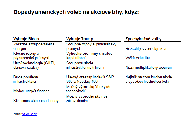 Následující tabulka ukazuje naše současné odhady tržních dopadů podle toho, zda 3. listopadu vyhraje Biden, nebo Trump. V delším časovém horizontu nebude pravděpodobně velký rozdíl v tom, kdo z nich zvítězí. Víc bude záležet na tom, zda se Demokratické straně povede získat najednou úřad prezidenta i celý Kongres. Nehledě na celkový obrázek bude prosperita některých odvětví nejspíš záviset na tom, který z kandidátů vyhraje. Níže jsou uvedeny naše odhady v dané situaci, ty se však mohou dál měnit podle toho, jak bude trh hodnotit prezidentské debaty.