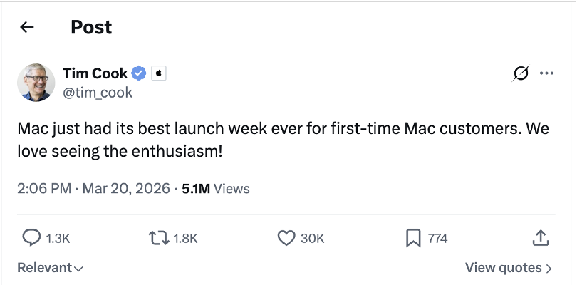 Přesto může být jeho význam mnohem větší, než naznačují samotná prodejní čísla. Podle Tima Cooka zaznamenal Mac nejlepší úvodní týden v historii z pohledu počtu nových zákazníků. A právě to je možná nejdůležitější signál. Nejde jen o marži na jednom zařízení, ale hlavně o to, kolik nových lidí Apple přivede do svého světa.