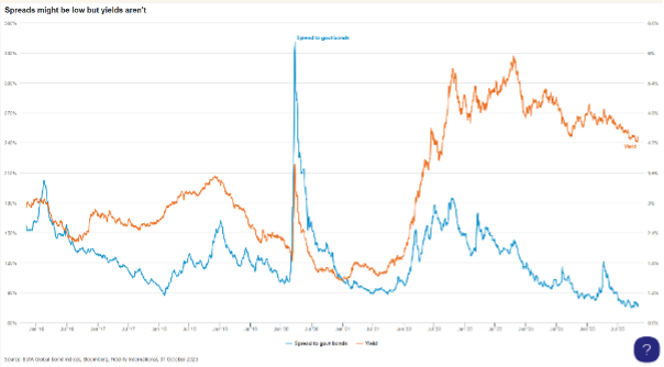 Spready nástrojů investičního stupně jsou extrémně těsné, což je znepokojivé – ale jsou těsné z určitých důvodů. Sazby jsou vysoké a poptávka po úvěrech od vysoce kvalitních emitentů je silná.