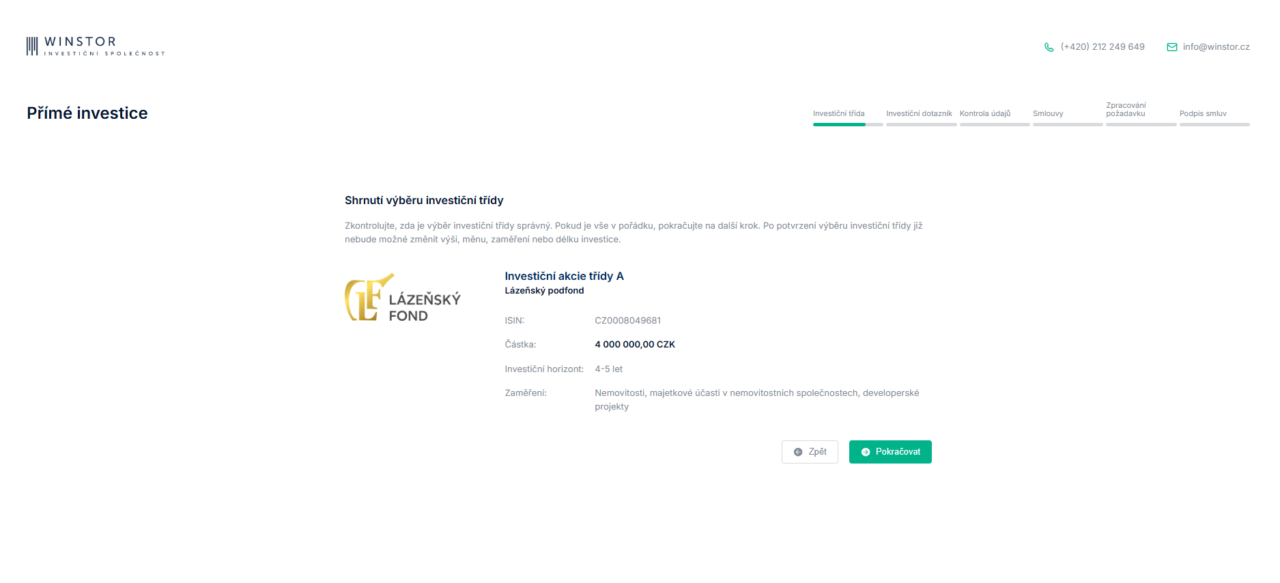 Investor si jednoduše vybere fond, který odpovídá jeho investičním cílům, a zvolí preferovanou investiční třídu. Díky integraci Bankovní identity se během několika vteřin ověří jeho totožnost, čímž se zcela eliminuje nutnost zasílání fyzických dokumentů či návštěvy pobočky. Poté je investor krok za krokem proveden procesem vyplnění nezbytných údajů a digitálního podepsání smlouvy.